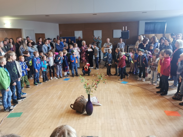 Der Empfang der Erstklässler wurde von den neuen Klassenvorständen und der Direktorin vorbereitet. Die vierten Klassen haben gute Wünsche für die Erstklässler vorgetragen. Und der Elternverein hat einen Stift-Radiergummi und Lesezeichen vorbereitet, die jedem Kind zusammen mit einem musikalischen Gruß einzeln überreicht wurden.